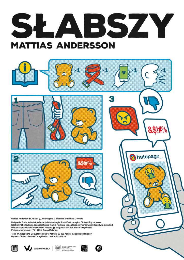 „Słabszy” to poruszająca historia o przemocy rówieśniczej, która pokazuje, jak głęboko mogą sięgać rany zadane w młodości. Spektakl opowiada o dwóch chłopakach — Martinie i Eriku. Kiedy byli jeszcze w szkole, Erik stale dokuczał Martinowi, wyśmiewał go i upokarzał. Po latach, już jako dorośli mężczyźni, spotykają się ponownie, by zmierzyć się z przeszłością, której nigdy tak naprawdę nie zostawili za sobą. Integralną częścią wydarzenia są warsztaty po spektaklu z udziałem aktorów, prowadzone przez edukatorkę Martę Kościańską.